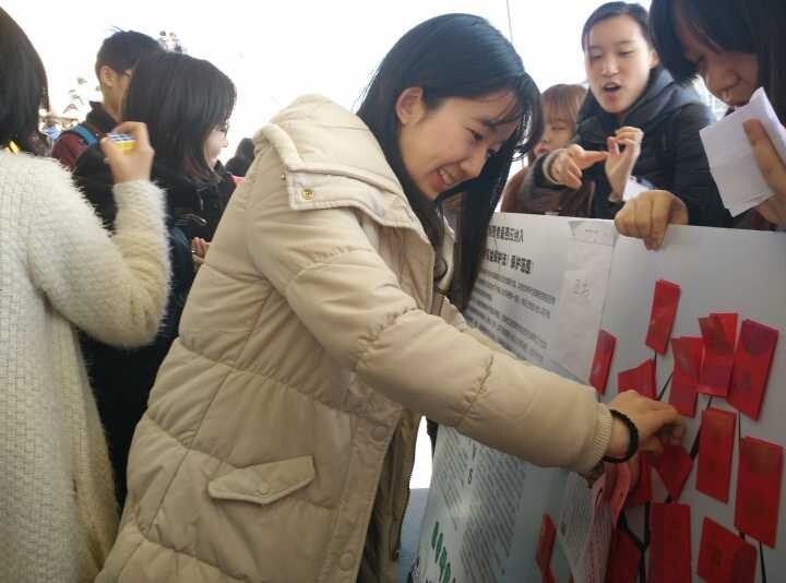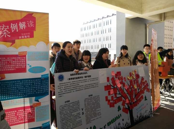 本次宣传活动的内容是写下自己对一个有关消费者权益保护议题的观点,从而抽取“红包”。活动现场布置一块展板,展板的一侧是议题内容——金融消费者是否应该纳入《消费者权益保护法》的保护范围。并提供一些正方和反方的理由以作引导。展示板的另一侧是贴满装有相应礼品兑换券的“红包树”。参与者写下自己对这一议题的看法,就可任意选取“红包树”上的一个红包撕下,按照兑换券的内容领取相应的礼品。为了吸引更多的同学参与,宣传的同学一起喊出“3·15”,写观点,拿红包”的口号,现场气氛十分热烈。