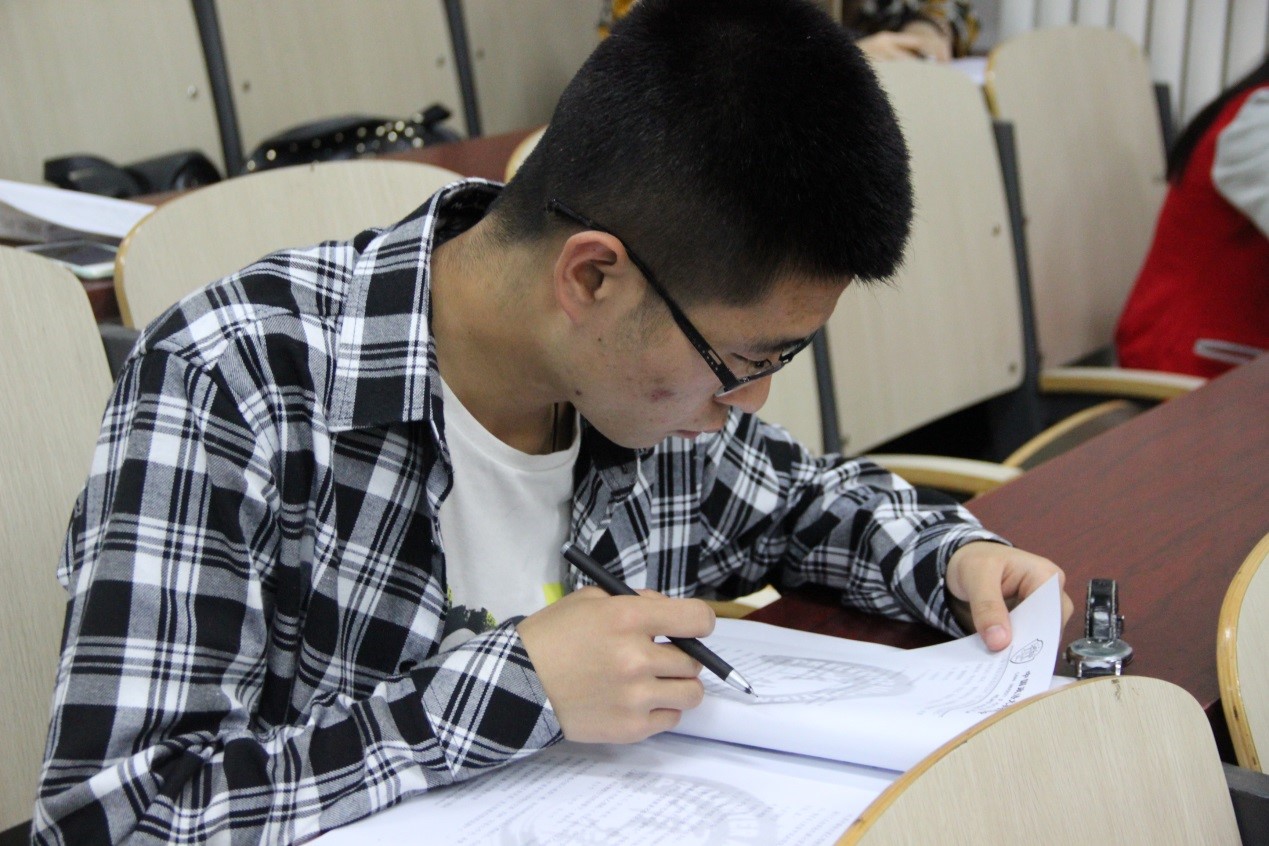 18点30分,工作人员准时分发试卷。同学们一拿到试卷便全身心投入做题中。考生认真答题,有的低头思索,一会儿愁眉紧锁,一会儿欣喜若狂;有的自信满满奋笔疾书。监考人员在教室来回巡视,这使考场内透露出了严肃的气息。同学们的专注让人感觉到“考场如战场”,每个人都在争取进入复赛的机会。