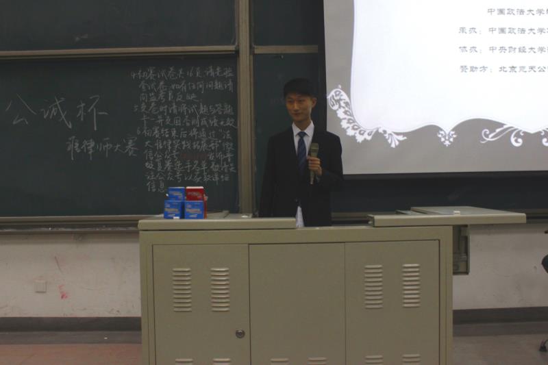 2017年4月7日晚6时30分,由共青团中国政法大学委员会、北京市学生联合会、中国政法大学社团联合会主办,中国政法大学准律师协会承办、中央财经大学法学研究会协办,竞天公诚律师事务所支持的北京市级法学实务技能竞赛——“竞天公诚杯”第十四届北京市准律师大赛中财校区初赛在沙河校区主教110教室准时拉开帷幕。中央财经大学和外交学院的参赛选手在中财沙河校区参加比赛。
