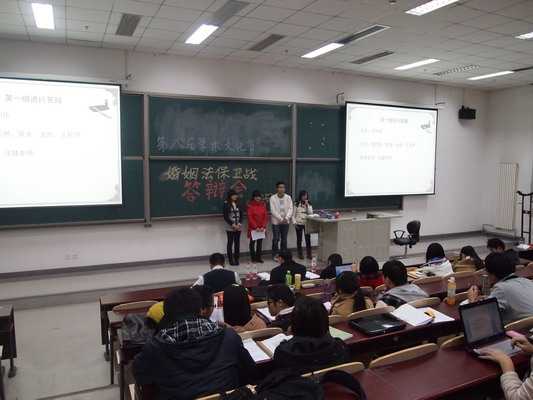 2011年12月1日,由法学院法学研究会举办的第八届学术文化节之“婚姻法保卫战”学术沙龙的最后一环节——优秀论文答辩与满完成。活动在沙河主教218教室于4:10分准时开始,出席论文答辩的评委有安新宇老师、沈健老师和李炎老师。