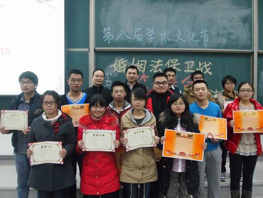 小组答辩由3至4人上台陈述时间约为3分钟,接下来由老师就论文内容进行提问时间约为8分钟。经过老师专业的点评及细致提问,使参赛选手们透彻的明白了自己论文的优点及不足。通过参赛选手们妙语连珠的回答,使得在场的观众加深了对婚姻法司法解释三的理解。活动最后经过老师精心的讨论评出了一等奖一名为冉烺小组,二等奖是两名胡银燕组及韦沛雨组,三等奖三名是朱利军组、李伟组及于梓萌组,并评出了优秀奖6组。在活动的最后老师与获奖选手们一起合影留念。
