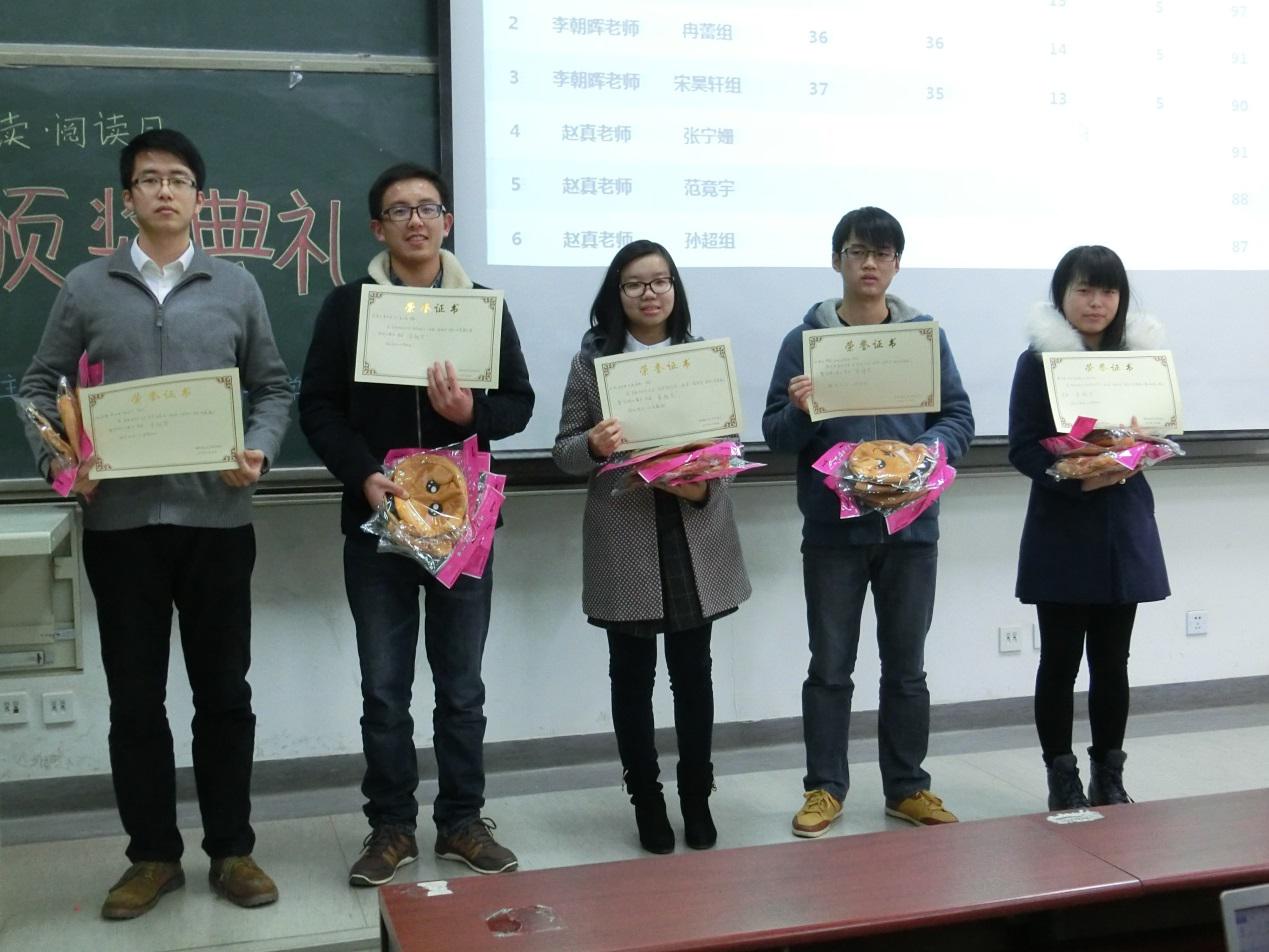 接下来就是最激动人心的环节,也是本次活动的核心环节——颁奖仪式,12组卓越奖和优秀奖获奖小组代表先后上台领奖。卓越奖获奖小组除领取到奖状外,每人还获得了爱心加热鼠标垫一个,使大家在寒冷的冬天因读书而多了一份温暖。