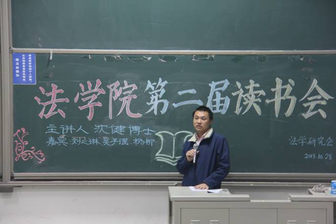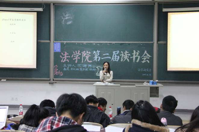 宣讲会的第一部分是法学研究会的指导老师沈健博士讲话,他为同学们阅读法律书籍提出了很多宝贵意见。首先是要阅读法学教科书,这样才能了解法律书籍的背景及基本含义;其次,在现代化飞速发展的今天,我们能静下心来认真阅读一本书籍是尤为可贵的,摒弃功名利禄,才能体会书中内涵;最后,学贵有恒,要想看透一本书,必须坚持下去。这些意见平实质朴,但给予我们这些法学初学者莫大的帮助。