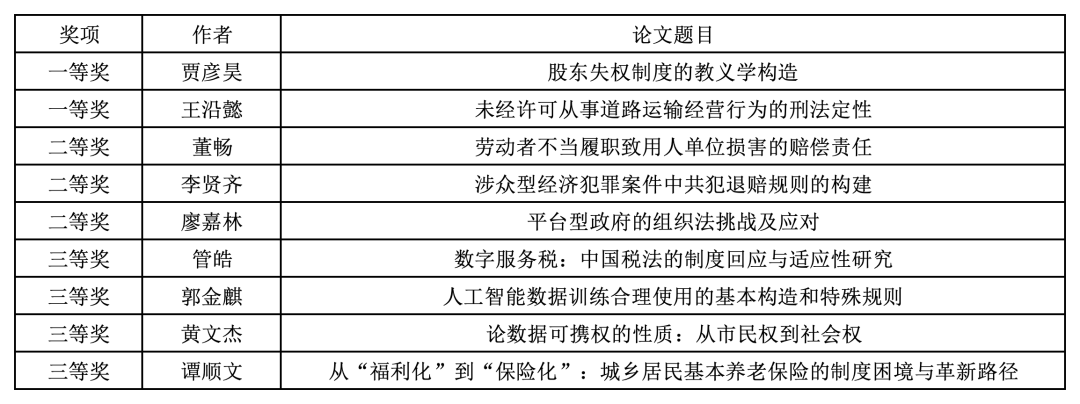 本届大赛由中央财经大学法学院研究生会、《中财法律评论》编辑部承办,于2025年1月14日正式启动。收稿截止后,先由《中财法律评论》编辑部对全部参赛作品进行初审;再由王叶刚教授、徐建刚副教授、周游副教授、吴晓丹副教授、简爱副教授、刘馨宇副教授组成复评组,对进入复审的参赛作品进行双向匿名评审确定终审名单。