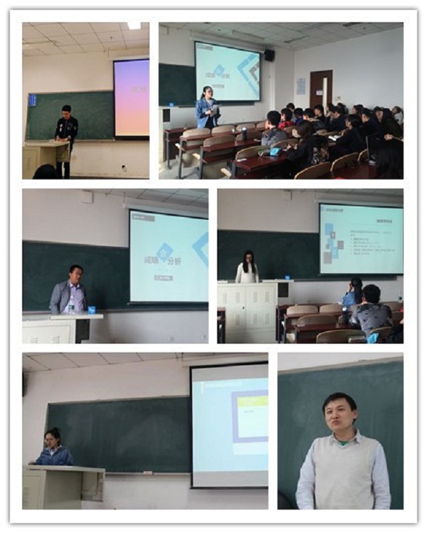 会上各班学习委员向大家做了成绩分析的展示汇报。汇报中,学委对同学们上学期班级整体平均成绩、成绩分布、各科平均成绩、考试通过率等进行了整体分析,结合不同科目的成绩进行了总结归纳并提炼了相关课程的学习方法和心得,同时对接下来本学期的课程学习给予了借鉴性建议。综合来看,各班成绩呈现“两高一少”的特点,即高分数段的学生比例越来越高、考试通过率越来越高、挂科门次及人数越来越少,学生学习成绩整体提高趋势明显。在班级的横向比较中,涉外班的平均学习成绩略高于应用复合班。