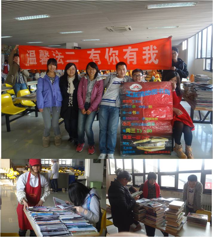 11月17日上午11时30分,12级法学2班的志愿者们和星火工友部的同学在食堂一楼共同创建了星火工友图书角,在十八大胜利召开的背景下,本次活动作为主题教育活动中的捐书活动取得了实质性的突破和圆满成功。