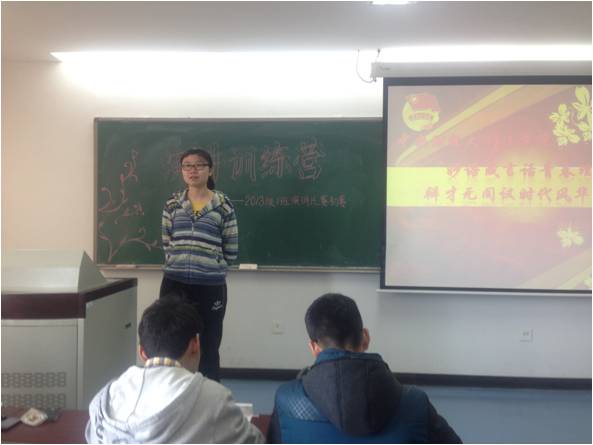 团支书彭倩茜同学首先向大家介绍了评分规则:每位同学上台进行3分钟以内的脱稿演讲,由专门同学负责计时提醒,其余同学依据演讲者主题是否鲜明、逻辑是否严谨、语言是否流畅、表达是否清晰等考评标准进行记名制打分,选出了总分排名前六的同学晋级决赛,以保证比赛的公正性。随后,比赛正式拉开帷幕。第一位进行演讲的是李浩宇同学,他从时事热点互联网金融这一角度切入,就这一问题阐述了自己的理解,体现了对财经热点问题的关注,他深入浅出的演讲成为了比赛的一个良好开端。接下来,同学们按照学号顺序依次上台进行演讲,每一位同学的演讲都有其独到之处:不少同学从身边的雾霾现象谈起,拷问生态保护;有的同学则从汉族服饰这一点,以小见大,漫谈对中国传统文化的保护,感悟文化新变;作为法学院的学生,更多的同学选择了结合当下法治中国的建设历程,成就自我理想的话题。同学们或从中外历史长河中寻找法治的例证,或结合时事,从当下最新鲜的热点问题和政策焦点出发解读法治,畅谈青春理想。