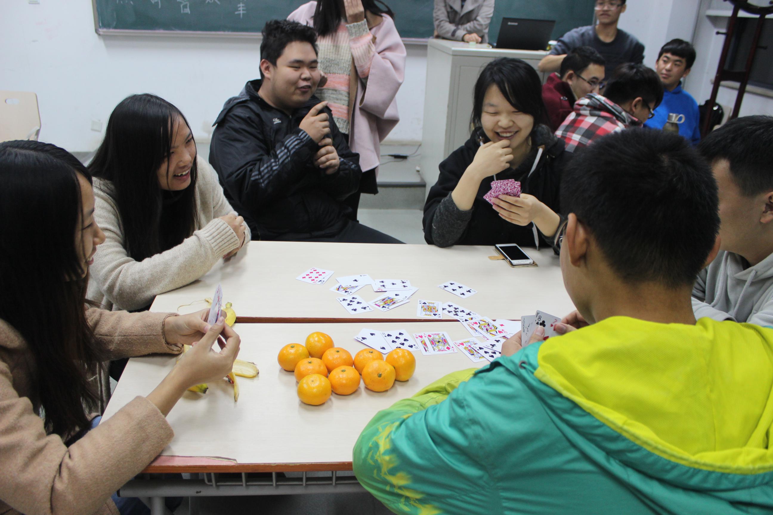 班会首先进行的是预热活动“谁是扑克王”,在本环节中,主持人把大家分成五组,进行小组的扑克赛,决出一名获胜者,获胜同学代表小组参加终极决战。经过同学们及获胜者的激烈交锋,张睿智同学获得了最后的胜利,赢得“扑克王”的称号,而失败的同学和其支持者则获得相应的惩罚。预热环节之后,班会的气氛也活跃起来。在同学们的欢声笑语中,主题班会正式开始。