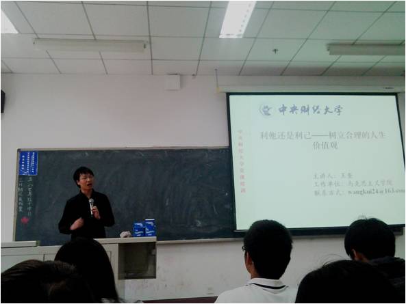 王奎博士通过利他还是利己的详细讲解之后,将这一理论与树立合理的人生价值观相融合,并以小悦悦事件为例,说明了当今社会应倡导利他主义的美德。随后,王奎博士与同学们一同探讨了利他主义的必要性,并引用马斯洛的需求理论,从人的生理需求、安全需求、归属与爱的需求、尊重的需求以及自我实现的需求这五大需求,说明了人从低级发展到高级的历程。在国内,冯友兰先生的“四境界”说,即自然境界、功利境界、道德境界、和天地境界也很好的解释了利他主义的必要性。讲课最后,王奎博士以如何看待陈光标高调行善这一问题与同学们进行了讨论,同学们踊跃发言,课堂气氛活跃。