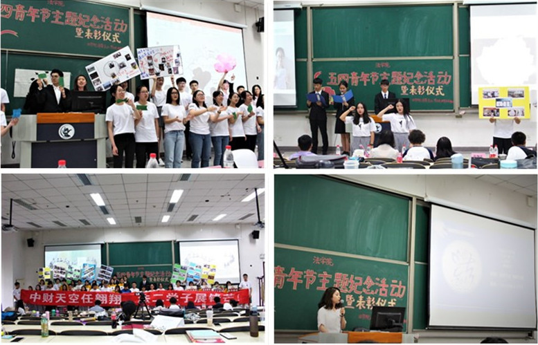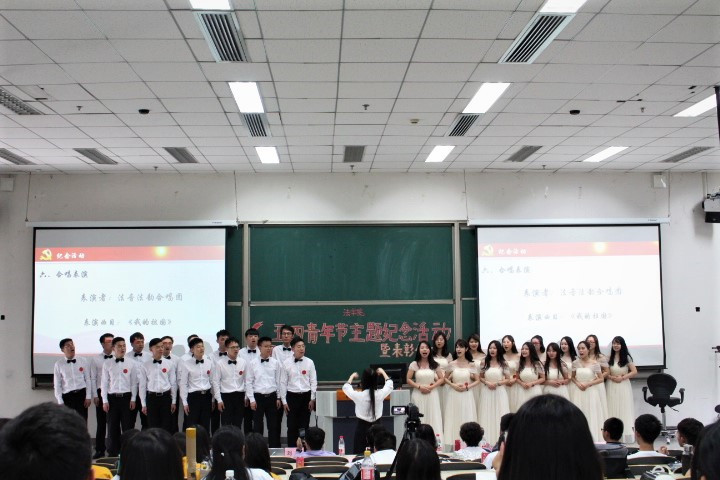 第二单元的“纪念活动”环节,来自我院本科和研究生的六个班级以短剧、歌舞、讲演等丰富形式,展示了各自班集体过往一年当中在组织建设、班风建设、学风建设等方面所取得的丰硕成果,充分体现了青年一代蓬勃向上的拼搏精神和众志成城的凝聚力。我院“走进新时代 我的法治梦”主题演讲比赛第一名获得者梁英南同学带来的演讲《我的中财梦》以磅礴的气势传递出了永不言败的龙马精神。随后展映的法学院第三届普法微视频大赛优秀作品《勇敢说不》凝结了同学们对现实法律现象的深入思考,将书本知识转化为实践中的法律思维能力、法律表达能力和对法律事实的探索能力正是新时代法治人才培养的题中应有之义。一曲由我院研究生合唱团表演的曲目《我的祖国》使纪念活动在委婉动听的歌声中画上了圆满的句号。