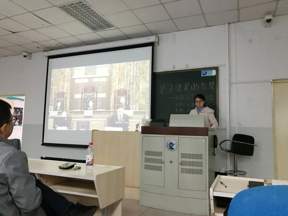 首位分享人是在海淀区人民法院实习的2017级法学硕士研究生郑磊茜同学,他诙谐的语言令在场的同学忍俊不禁,更使同学们对法院实习生活有了初步的了解。随后,2017级法律硕士研究生刘欣宇同学通过分享她在北京市二中院几则亲身所见的案例,让同学们明白了法律不仅关乎规则,还关乎规则背后的价值诉求,关乎回应人心所向、塑造伦理人情。