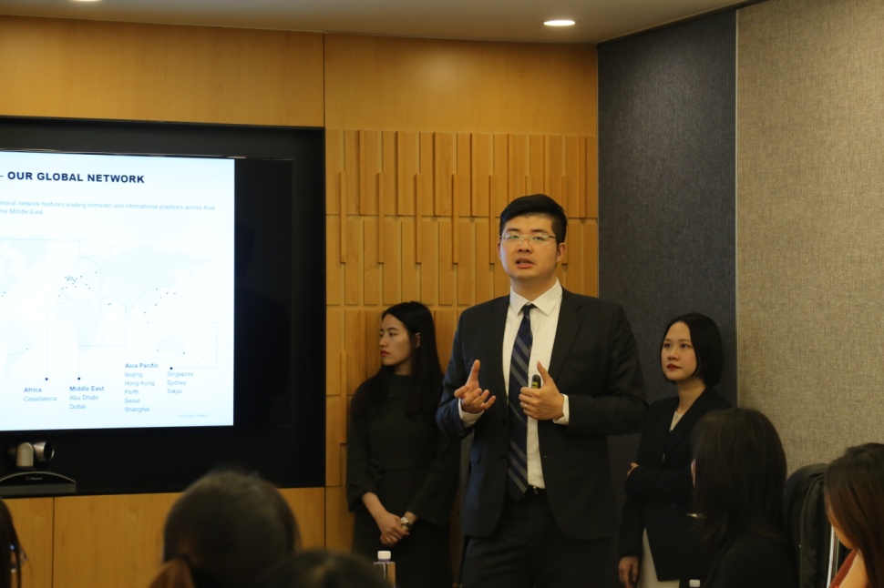 第一环节是刘天峰高级律师对律所的基本情况作介绍,主要从全球网络布局、视野和策略、中国业务三方面展开。刘天峰律师从英国航海贸易,人口地貌等历史背景角度出发,分析高伟绅走全球化道路的原因:在当今经济全球化加速发展的情况下,对人才和法律的需求将日趋旺盛。从地理布局和业务领域来看,对比美国的律所,高伟绅的战略不只追求“精”,而是把“面”铺开,业务广泛覆盖亚太地区和欧洲大陆。同时,刘天峰律师以我国外汇交易中心举例跨国业务的需求,律所在国际化项目中的作用便是细致分析当地监管要求,促使项目合规开展。