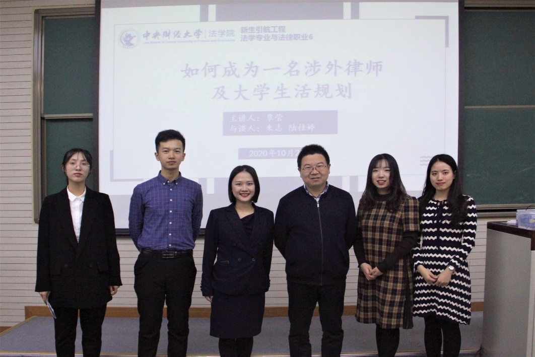 2020年10月26日下午16点50分,我院于学院南路校区主教学楼104教室举办2020级本科生“法学专业与法律职业”课程暨新生引航工程讲座。本次“如何成为一名涉外律师及大学生活规划”主题讲座由目前就职于高伟绅律师事务所的中央财经大学法学院2012届本科生覃莹主讲,法学院2019届本科生朱志、2020届本科生陆桂婷和17级本科生刘兴淼与谈。本场讲座由20级本科生陈莉主持, 2020级全体本科生参加。