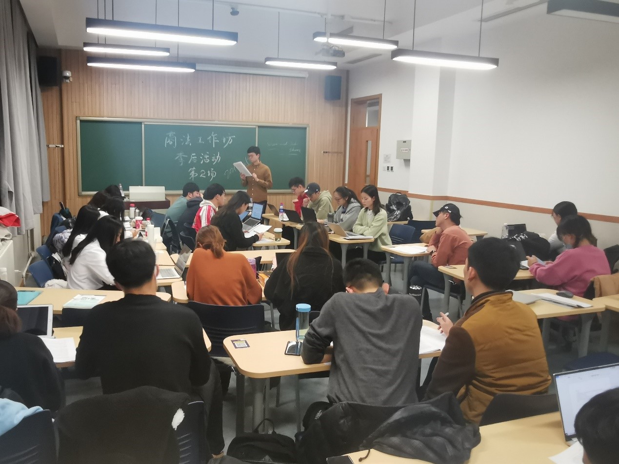 2021年11月25日晚上7点,商法学研究工作坊2021年季后活动第2场在学院南路校区主教115教室举行。商法研究团队2020级研究生崔安南、侯涵斌、郑岩、蔡晓灵,2021级研究生符大卿、林晟、马晟、孙呈玥、王天琦、黄凯旋以及20余名法学院学生参加了本次研讨活动。本次活动由商法工作坊指导老师周游副教授主持。
