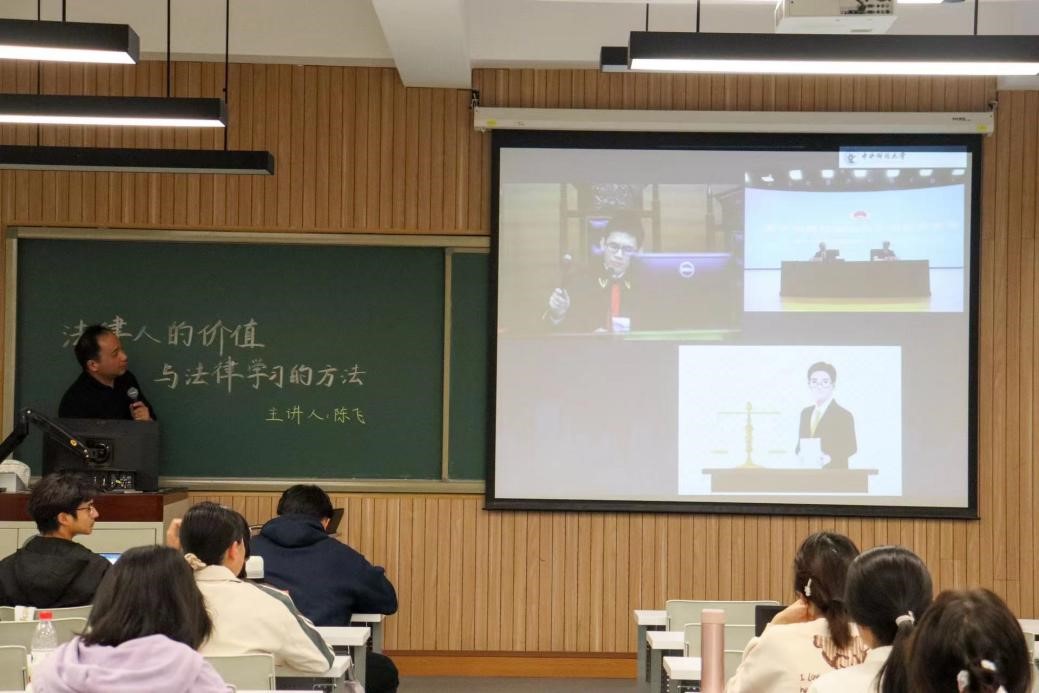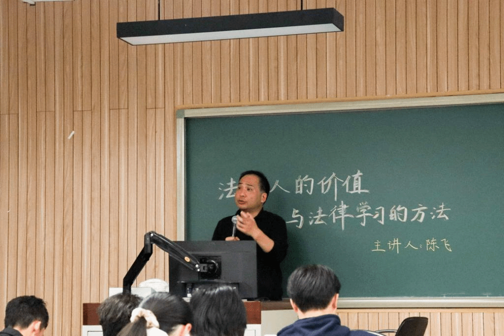 陈飞老师主要围绕“一则案例”“什么是人的价值”“法律人的价值”“法律的学习方法”四个方面展开讲述,带领同学们深入认识法律人的重要价值,探索学习法律的方法。