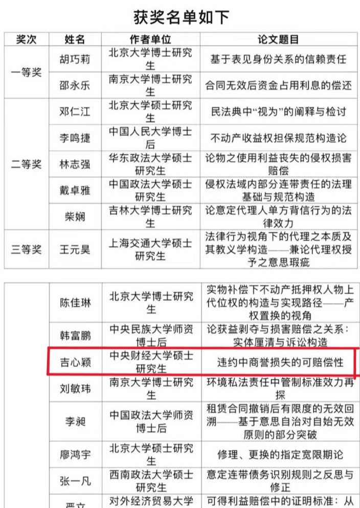 2023年12月16日,由西南政法大学民商法学院、中国政法大学民商经济法学院、华东政法大学法律学院、中南财经政法大学法学院联合主办,西南政法大学民商法学院承办的“第四届全国民商法博士生论坛”在重庆市西南政法大学渝北校区成功举行。经前期征文与专家评审,来自全国10余所高校的20余位优秀硕博士研究生、青年学者作为报告人受邀出席。我院21级法律硕士(非法学)研究生吉心颖投稿的论文《违约中商誉损失的可赔偿性》获评三等奖,并应邀作报告。