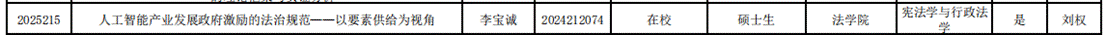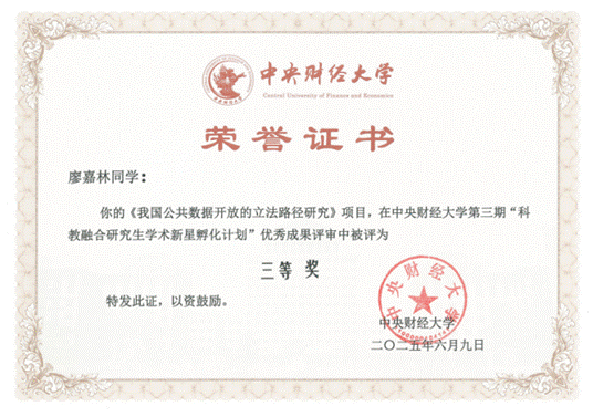 经过研究生院组织严格匿名评审和现场评审汇报,我院2023级博士生廖嘉林主持的《我国公共数据开放的立法路径研究》项目最终获评三等奖,指导老师刘权教授获评优秀指导教师奖。项目聚焦研究我国公共数据开放的立法路径问题,通过考察全国41部公共数据开放地方立法文本,论证制定“公共数据开放条例”的正当性和必要性,研究破解制定该条例中的法治难题,有助于加快释放公共数据要素价值,深化公共数据治理理论。