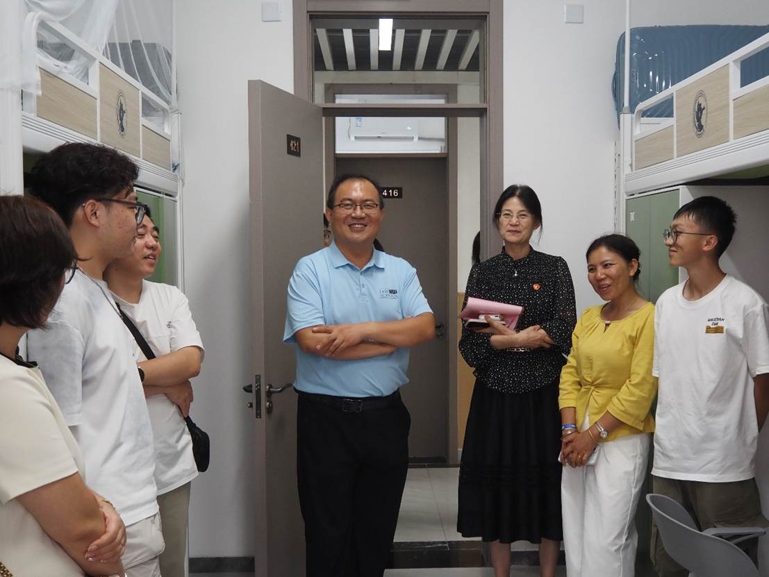 16:00,法学院领导班子成员前往学生宿舍,仔细察看居住环境,与新生和家长们面对面交流,鼓励同学们尽快适应大学校园生活。