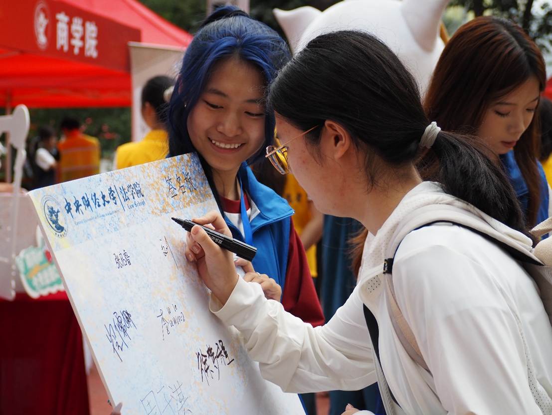 学院还为新生精心准备了迎新大礼包,内含《中华人民共和国宪法》、校园指南、专业学习手册等实用资料;现场设置的“迎新签名板”前,新生们陆续留下姓名,一笔一划间,定格下与中财大法学院的初遇记忆。此外,校园内随处可见的志愿者团队分工明确——从身份核验、手续办理,到路线指引、行李搬运、疑难解答,每一项服务都有条不紊,让忙碌的迎新现场始终充盈着温暖。