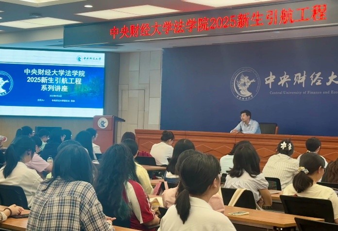 2025年9月4日,中央财经大学副校长栗峥教授为法学院 “新生引航工程”作专题讲座。院党委书记于文豪教授主持讲座,院党委副书记徐颖、副院长刘权、院党委组织员陈诚和学院2025级全体本科生参加讲座。