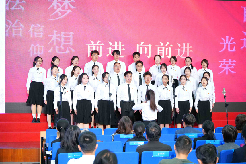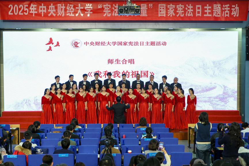 法学院学生合唱团《宪法的力量》主题表演,展现了宪法在每个人成长过程中的重要意义。法学院本科生董雪一、张华庆《宪法传承:青春与信仰同行》主题演讲,诠释了宪法保障人民民主权利和根本利益的至高力量。学校研究生宣讲团成员、金融学院李菲阳《金融强国建设的宪法力量》主题宣讲,讲述了中国共产党领导下的货币工作发展历程中体现出的宪法价值与金融为民情怀。法学院副教授赵真《以习近平法治思想为指引,充分发挥宪法的时代伟力》主题宣讲,讲述了党中央领导全国人民全面推进依宪治国、更好发挥宪法作用的奋斗历程。学校教职工合唱团与法学院学生合唱团共同演唱《我和我的祖国》,将本次活动推向高潮。