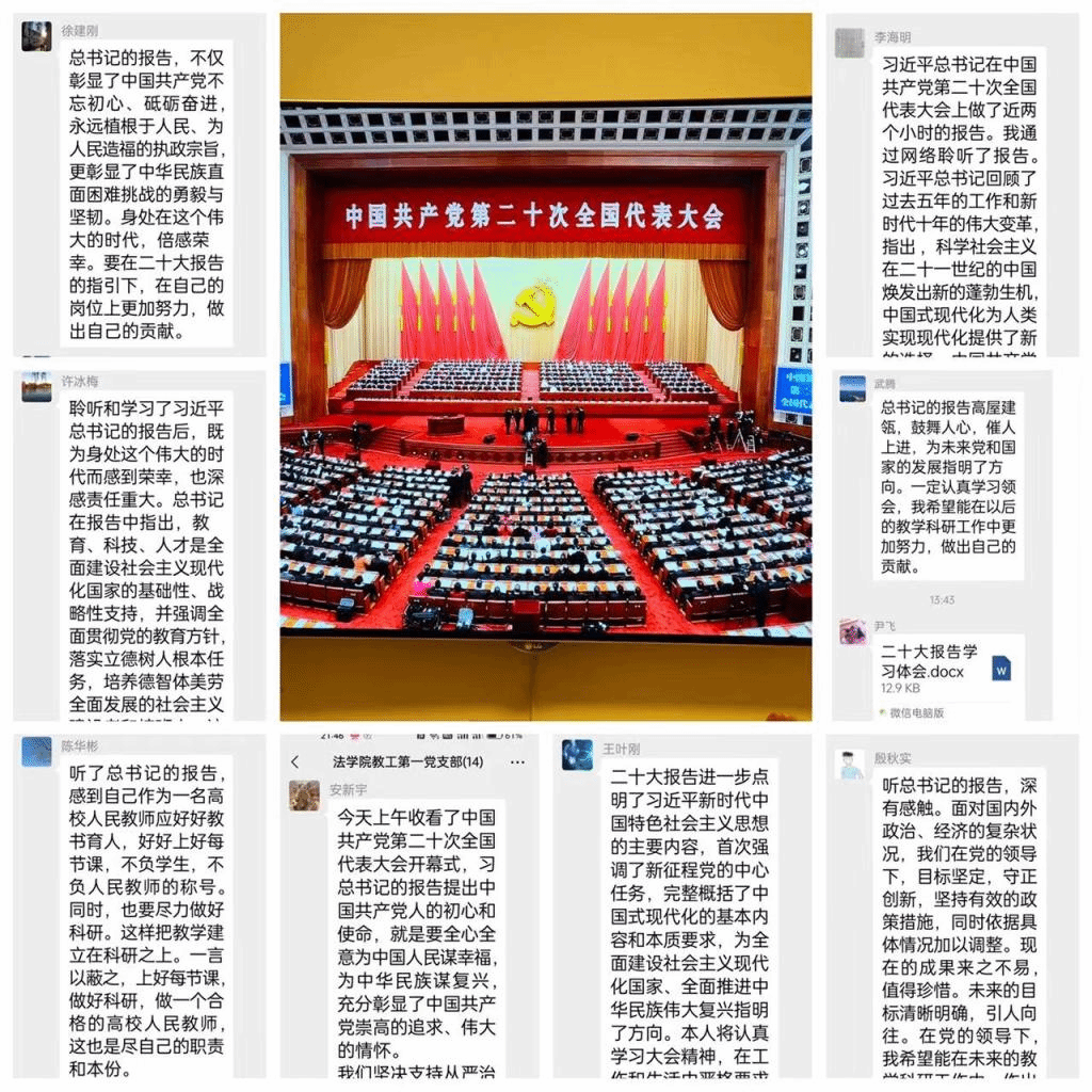 法学院教工第一党支部此次学习二十大报告的活动结束了。此次活动中支部支委,党员领导干部,学科带头人,青年党员教师都发挥其先锋模范作用,以行动诠释了学院教工第一支部作为特色党支部的先进性及和较高的政治思想觉悟。二十大报告内容丰富,我们支部将在后续的活动中继续学习,进一步领会和提高对二十大报告的认识。