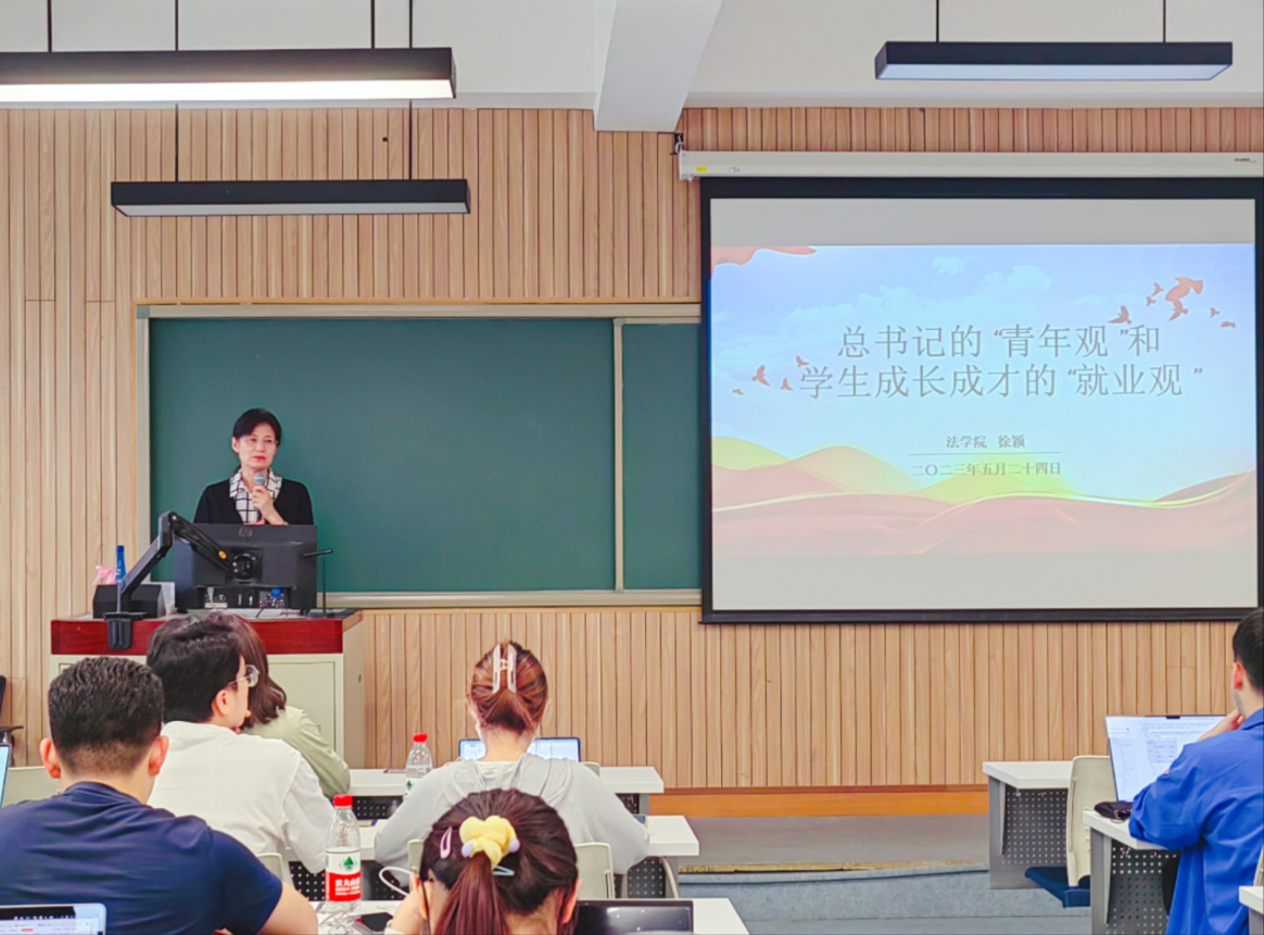 5月24日下午,法学院党委副书记徐颖在学院南路主教117,以《习近平总书记的“青年观”和学生成长成才的“就业观”》为题,为法学院本科生党支部、2021级法律硕士(法学)第一党支部、2022级法学研党支部的师生党员讲授了一堂生动而深刻的主题教育专题党课。党课由本科生党支部书记张明华主持。