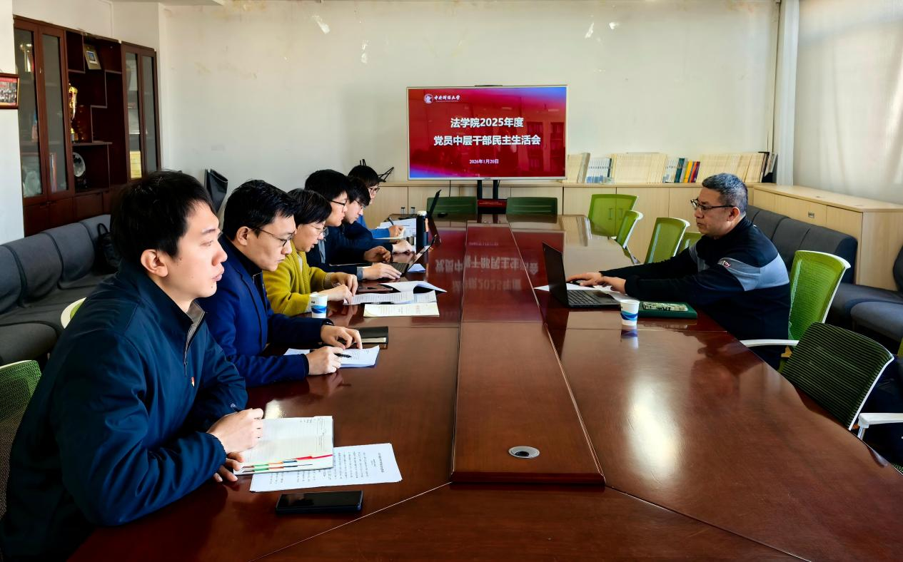 根据学校通知要求,1月20日下午,法学院党委召开 2025 年度党员中层干部民主生活会。学校党委第九联系指导组组长郑朝阳到会指导。会议由法学院党委书记尹玉主持,学院全体中层干部参会。