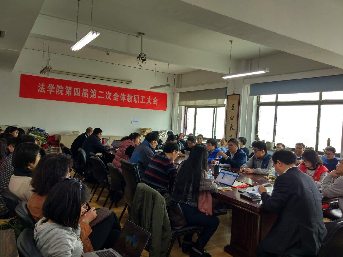 2018年3月14日,法学院第四届第二次全体教职工大会在法学院会议室顺利召开。法学院全体教师出席了大会。会议由法学院分工会主席曹晓燕副教授主持。