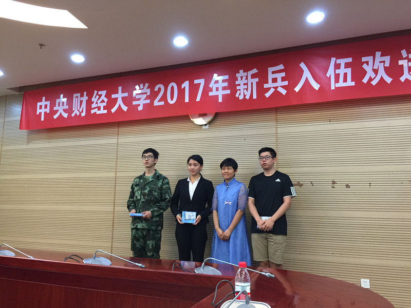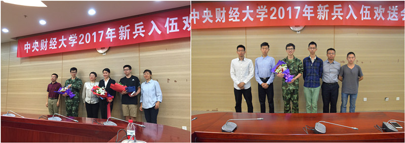 为了支持和鼓励广大青年在校大学生积极投身于我国伟大的国防建设事业,9月11日上午,我院党委书记吴韬、团委书记尹力沉和三位学生代表受邀参加了2017年中央财经大学新兵入伍欢送会,为我院2016级本科生徐航同学以及经济学院唐烁、保险学院刘南坤三位同学共同送行祝贺。