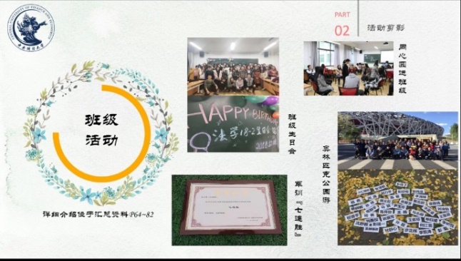 法学18-2团支部,四十三位来自全国各地的青年学子汇聚于此。我们团结并进,亲如一家,将最美好的青春挥洒在中财大这片沃土之上。在过去一年半中,支部秉承“携手并进 努力进取”的思想,努力完善支部建设,荣获2018年度“班级建家”标兵班、2018-2019学年“校级双优班集体”、2019年度“五四红旗团支部”等荣誉称号。支部成员乐于奉献,积极参加各种志愿活动的同时锐意进取,形成“博学审问 慎思明辨”的优良学风。在以后的大学生涯中,我们会将努力和坚持化为盔甲,鼓号同齐,我定乾坤。眼眸有星辰,心中有山海,以梦为马,不负韶华。