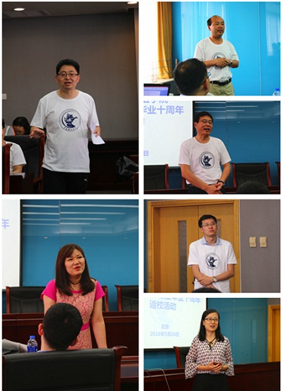 尹飞院长代表学院致辞并向校友们介绍了学院近年来的发展成就。尹院长指出,2006级法律硕士是中央财经大学法学院的第一届法律硕士生,揭开了我院人才培养的新篇章。十年中,校友们的成长与进步让老师们感到欣慰,校友们取得的优异成绩让学院引以为傲。过去的十年中,在广大校友的关心以及在校师生的不懈努力下,学院进一步凝练办学理念,进一步提炼办学特色,在人才培养、师资队伍、学科建设、学术科研等方面成绩斐然,“一流标准 财经特色”的办院理念深入推进,办学实力得到了全方位提升。他勉励校友们在各自工作岗位上勤奋工作,为国家财经领域法治建设添砖加瓦。尹院长希望校友们今后能“常回家看看”,多与学弟学妹们交流,一如既往地为学院发展贡献力量。甘功仁教授以中央财经大学法学院法律硕士教育的“第一粒种子”来比喻2006级法律硕士生,他希望校友们在各自岗位上不忘初心,“发芽”、“开花”。王克玉教授带来的“神秘礼物”——当年2006级法律硕士赠送的写满全体同学名字的明信片,让现场所有人为之惊讶和感动。一张历经十余年仍保存完好的明信片承载着学生对老师的无限感恩,更诉说着老师对学生的浓浓牵挂。曾筱清教授、黄震教授、李轩副教授、历咏博士都分享了当年授课的心得与体会,言语之间满是幸福与喜悦,并表达了对各位校友的美好祝愿。现场一段精心制作的毕业视频唤醒了大家脑海深处对学生时光的美好回忆,也见证着大家成长的脚步与印记。校友代表们纷纷发言,表达了对学院和老师的感谢,也分享了工作以后对法律职业、法律专业的理解和体会以及对未来的美好祝愿。李炎老师主持了“十年相聚,不负韶华”主题班会。