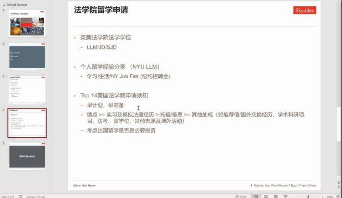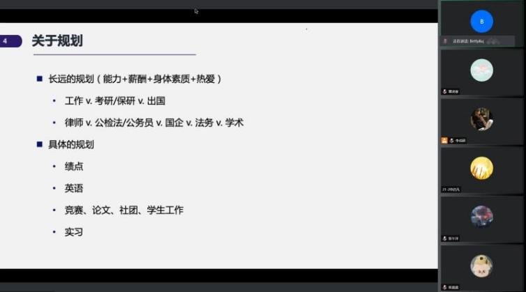 最后,安然校友就同学们的未来发展,重点说明了法科学生留学申请所要注意的问题。她向同学们推荐了几所英美法学院,并结合自己的留学经验,从学习、生活和招聘会等多方面进行分享。同时,安然校友建议同学们尽早为自己的未来发展方向做出计划和准备,鼓励大家着眼于未来,好好规划自己的人生道路。