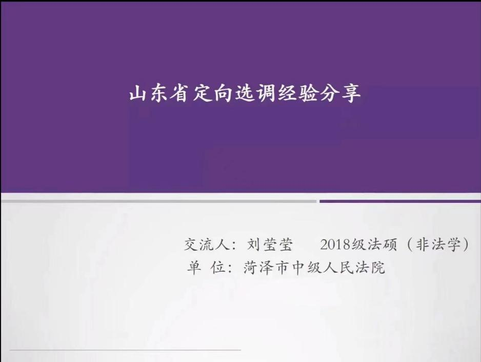 第二位分享人是2021届法律(非法学)专业毕业生刘莹莹学姐,选调于菏泽市中院。在前一位伟杰学姐分享的基础上,莹莹学姐在选岗和备考两个方面补充。