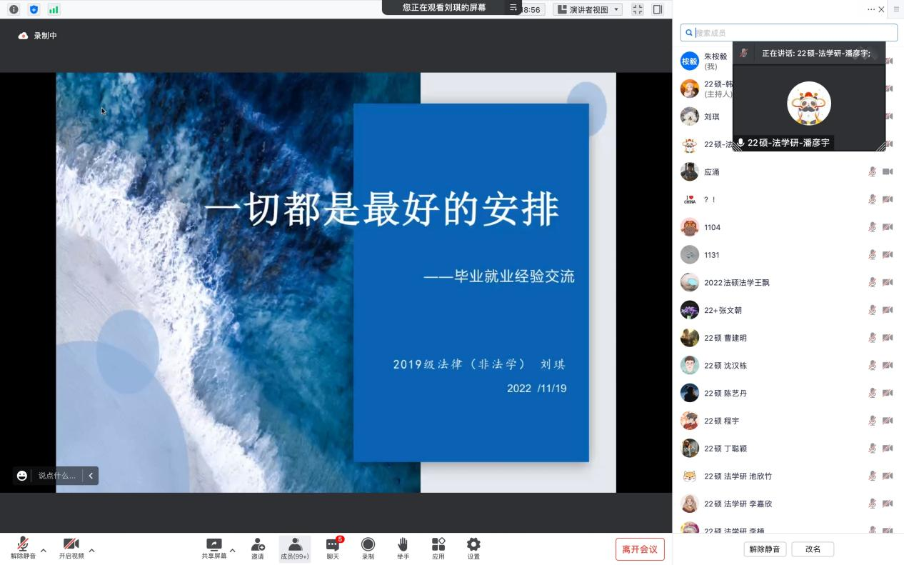 中央财经大学法学院“新生引航系列讲座·毕业就业分享会”金融机构专场讲座于2022年11月19日在线上顺利举行。学院特邀刘琪、应涌、黄贺琪、周子扬、周远洋五位2022届毕业生作为本次分享会的嘉宾。法学院党委副书记徐颖研究员、副院长李伟副教授、2022级研究生辅导员李紫仪老师出席本次活动,讲座由2022级法学硕士研究生潘彦宇同学主持,共计280余名同学参加。