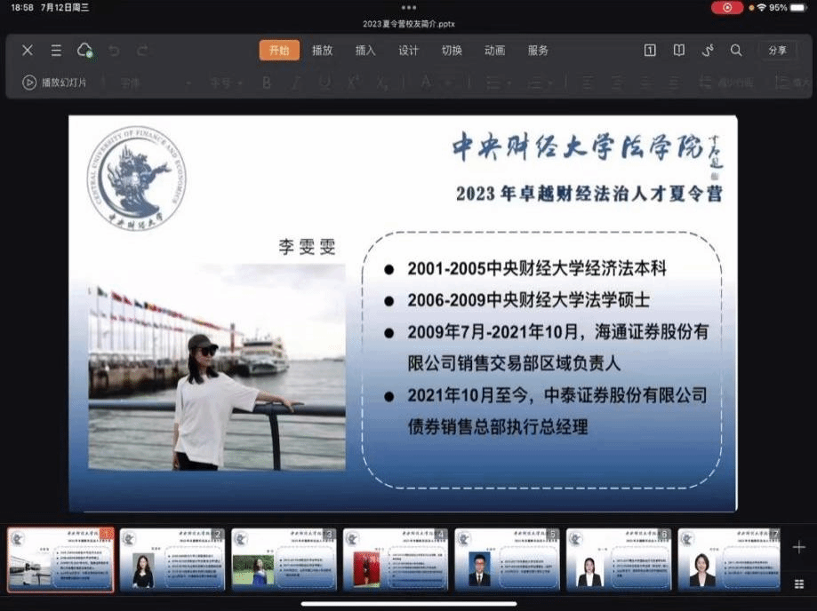 接下来七位优秀校友代表依次进行了经验分享。首先,由李雯雯校友和樊潇婷校友分别对于在证券投行等相关领域工作的经验感受,李雯雯校友主要就债券领域进行了较微观的分享,樊潇婷校友对于证券领域给出了更宏观的分析。之后,雷悦校友强调了在研究生学习期间注重对于学术方面能力的提升并鼓励营员们善于从学生工作经历和实习机会中汲取经验,同时分享了自己法院工作的经历感受。在此之后,由项宇飞校友对于证券领域股权方面进行了分享,并结合个人的基本情况,在校学习与工作经历和在学业选择中对于就业的考虑向营员们提出了宝贵建议。然后,宋昊轩校友就自己的学习工作经历,对于中财法学院的认识与感受和研究生就读与就业建议三方面进行了讲述。孙一玮校友对于自己的学习工作经历进行介绍,着重指出了论文写作能力和沟通能力的重要性。最后,宋亦淼校友对于自己在学术科研方面的经历,实习经历和求职体验进行了分享并就如何提升个人核心竞争力提出了建议。