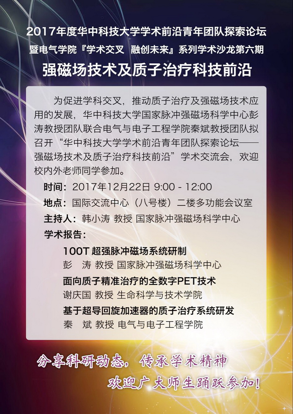 为促进学科交叉,推动质子治疗及强磁场技术应用的发展,华中科技大学国家脉冲强磁场科学中心彭涛教授团队联合电气与电子工程学院秦斌教授团队拟定于2017年12月22日,在校国际交流中心(八号楼)二楼多功能会议室召开“华中科技大学学术前沿青年团队探索论坛——强磁场技术及质子治疗科技前沿”学术交流会,欢迎校内外老师同学参加。