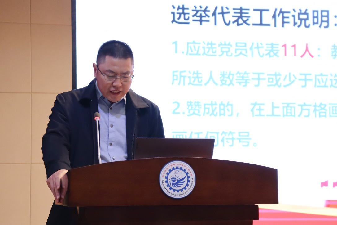 张明主持了本次选举工作。张明介绍候选人产生过程,组织表决通过了学院参加学校第五次党员代表大会的候选人名单,通过了选举办法。会上通过了总监票人、总计票人及监票人、计票人名单,纪委书记秦斌担任总监票人,电机系主任李达义教授担任总计票人。