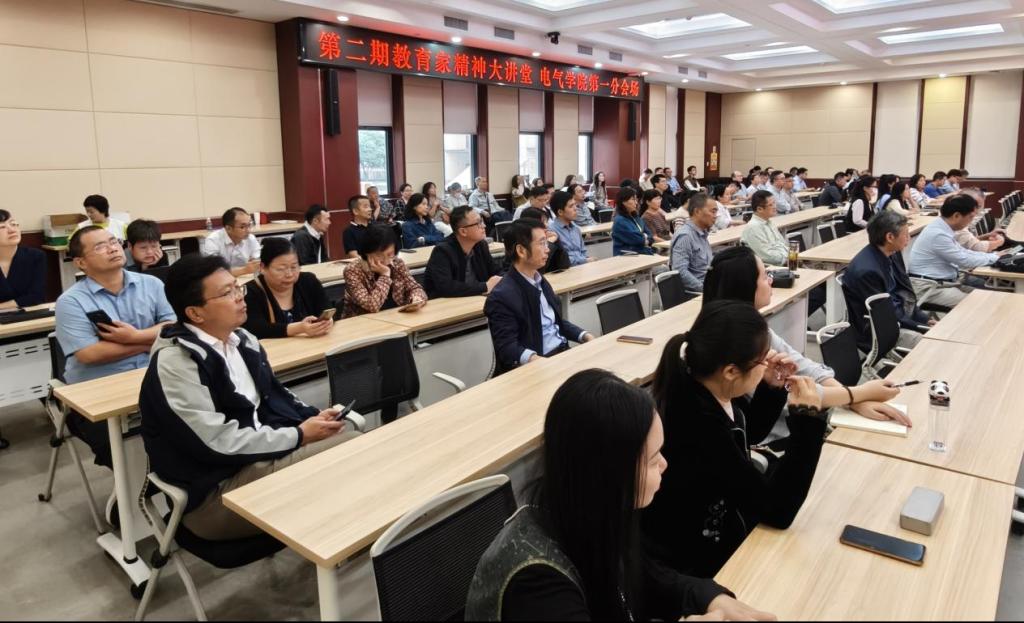 2025年9月25日下午华中科技大学第二期“教育家精神大讲堂”在管理学院报告厅举行。电气学院在电气大楼B201报告厅、强磁场中心、应电楼、电力系、聚变所设置5个分会场集中学习。本期讲堂聚焦我国著名金属材料专家、中国工程院院士崔崑教授的感人事迹。一位毕生奉献于祖国特殊钢事业的“钢铁院士”,一位将千万积蓄倾囊助学的“慈善长者”,崔崑院士用他近一个世纪的坚守与奉献,为全校师生上了一堂生动而深刻的教育家精神示范课。