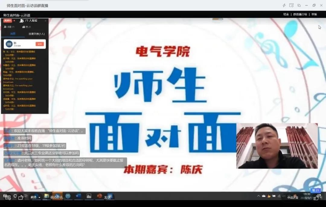 据悉,自疫情爆发以来,电气学院主动关心学生困难、关注学生发展,积极利用网络平台,打造了一系列线上活动,空中“院领导接待日”,分别举办了本科生专场、研究生专场和应届毕业生专场,畅通了学院与学生沟通的渠道;空中“师生面对面”,截止目前已举办5场,给学生提供了与学术大牛们面对面交流、了解学科前沿和发展方向的机会;空中“辅导员面对面”,辅导员根据自己所长开设别样的“培训课”,如“思维导图”、“新闻稿写作”、“PPT制作技巧”等专场,帮助同学们get新技能;空中“优秀学子面对面”,邀请众多优秀学子分享成长秘籍,启迪智慧。每场线上活动参与学生少则近百人,多则两三百学生同时云端聚会。一场场直播,是一份份干货,是一本本秘籍,是学院贯彻“立德树人”根本任务的一次次勇敢尝试,目的就是让学生在家期间也能明确发展方向,实现学有所悟,收获显著成长。