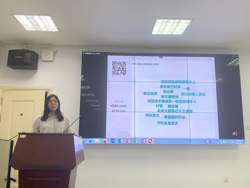 博士生宋菲以现场互动的方式,倾听师弟师妹们的心声,针对他们的关切,分享了自己如何从科研小白克服难关一步步走向成熟的成长历程。谈到自己的本科同学今年完成了研究生学业走向社会开始新的生活,有祝福,有羡慕,但同时也意识到仍作为学生的自己还能静心学习,有导师等人的指导,倍感珍惜自己在校的学习生涯。李冬老师分享了他对待“科研打杂”的理解,一个团队需要不同角色的配合,任何事情只要认真去做都会有收获。他也强调了科研与生活中对安全问题的重视。