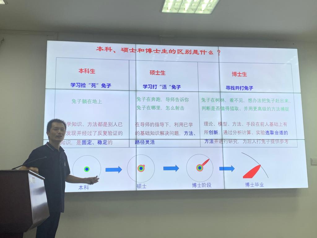 彭涛教授作为特邀嘉宾以生动风趣的方式讲述了本科生、硕士生和博士生学习与科研任务的不同,本科生好比是在老师的安排下练习“捡死兔子”,硕士生是在导师指导下学习“打活兔子”,博士生则是要“寻找并打兔子”。他结合自己的科研经历,详细剖析了如何完成一个科研项目,如何对待科研中遇到的困难和挫折,如何养成规范严谨的科研作风。