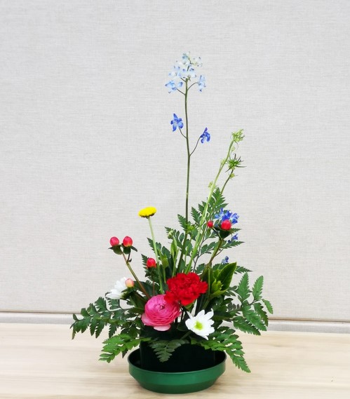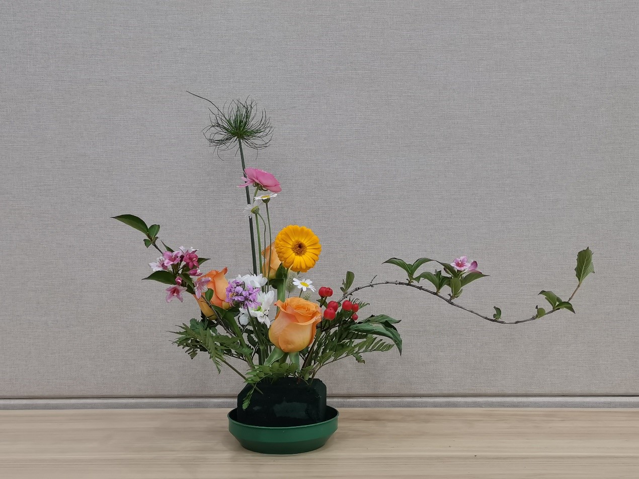 课程老师杨雪以东西方传统插花与现代花艺经典作品鉴赏为切入点,阐述了中西方插花文化的艺术风格与独特魅力。为了直观体现插花的道与艺,杨老师现场分享了许多插花作品。结合每一个插花作品,杨老师对插花式中“主、客、使”三主枝的要素,包括直立式、倾斜式、水平式、下垂式的四个基本花型以及瓶、盘、篮、碗、缸、筒六类插花容器等知识进行了介绍。