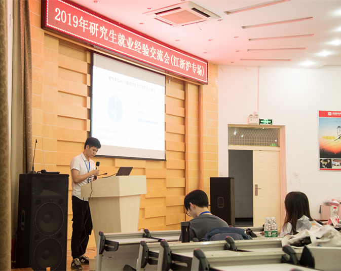 漆家炜向现场观众介绍电气学院研究生毕业去向和江浙沪地区就业概况。分别引用18届以及19届数据讲述总体就业概况和江浙沪地区就业概况。从地区上看,18届博士毕业生70%于湖北、广东、湖南就业;硕士毕业生70%就业于湖北、广东、江苏、浙江、上海。行业上看,18届毕业生中近一半前往电网公司,共135人。19届毕业研究生中,前往江浙沪地区的博士毕业生6人、硕士毕业生50人。博士生以科研院所为主,研究生以电网公司为主。