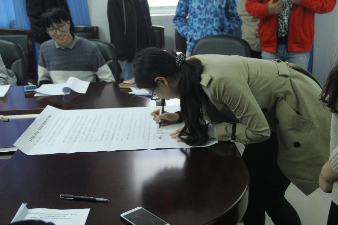 交流结束后,许文立带领大家宣誓,要求学生干部本着全心全意服务广大学生的宗旨,让责任、奉献与自律常驻心间。最后,李家成带领大家学习了《关于发起学生会、研究生干部自律公约的倡议》,并在自律公约上签名。