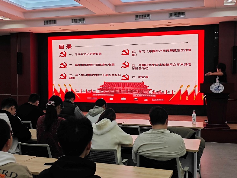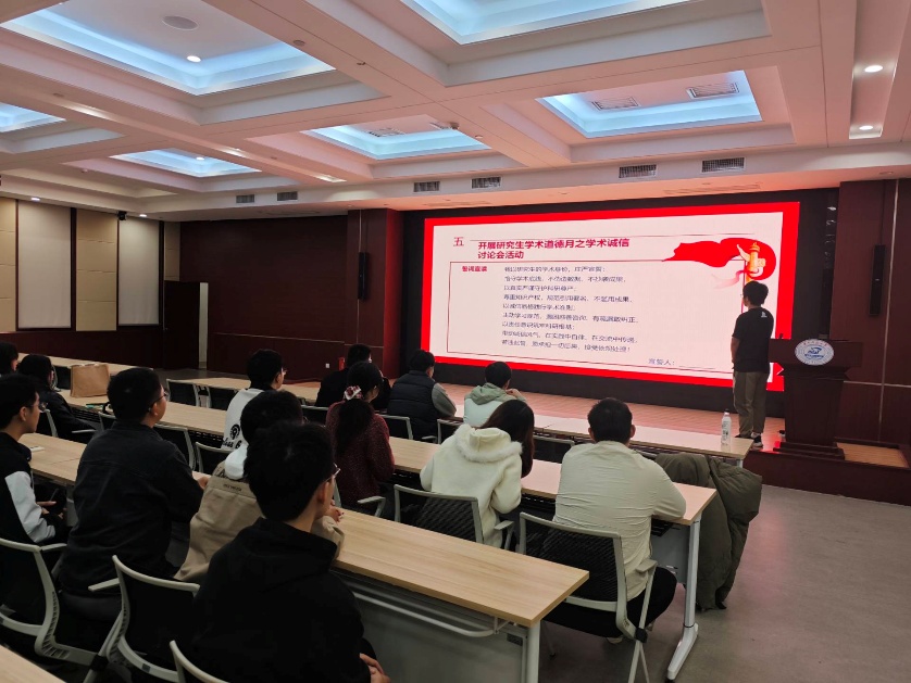 研究生学术诚信讨论会是本次活动亮点。陈汉文同志指出学术诚信是国家、学校和学院对研究生学习工作发展的关注重点,培养学术诚信意识与遵守学术道德规范,是研究生科研生涯的必修素养,需主动学习学术诚信相关的法律法规,了解学术诚信与学术道德的重要意义。党员围绕学术诚信话题深入交流后,全体庄严宣誓:“坚守学术诚信,恪守学术规范,杜绝学术不端,以严谨态度对待科研,以诚信品格追求真理!”铿锵誓言彰显了科研诚信担当。