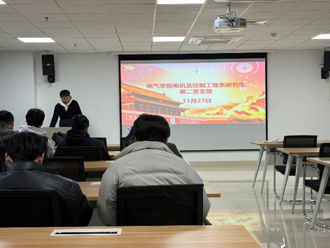 为进一步领会党的二十届四中全会的意义,全面把握 “十五五”期间持续推进中国式现代化建设的宏伟蓝图,电气学院电机及控制工程系研究生第二党支部于11月27日在电气大楼B302会议室开展十一月主题党日活动,活动由党支部书记王宋雨阳主持。
