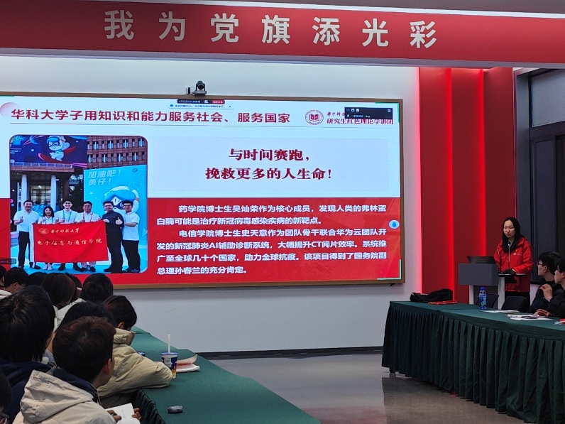 华中科技大学研究生红色理论学讲团时静同志带来《习主席寄语华科大青年》专题党课。她围绕习近平总书记“到祖国和人民最需要的地方去”的殷切寄语,结合青年党员在脱贫攻坚、乡村振兴、抗疫服务等领域的实践案例,展现华科大青年“把论文写在祖国大地上”的担当。支部成员深受触动,明确要以榜样为指引,将理想信念转化为服务国家的实际行动。