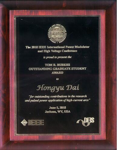 2018年6月3日至6月7日,IEEE国际功率调制器和高电压会议(IEEE International Power Modulator and High Voltage Conference,简称PMHVC)在美国怀俄明州杰克逊霍尔市召开,电气学院高电压工程系博士生戴宏宇(导师李黎副教授)因在大电流脉冲电弧方向的最新研究成果,获得Tom R. Burkes杰出研究生奖。
