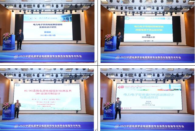 专题报告由管乐诗副教授和江彦伟副教授主持,浙江大学陈恒林副教授,华中科技大学蒋栋教授,哈尔滨工业大学(深圳)和军平副教授,深圳大学刘艺涛副教授分别作题为《电力电子系统电磁兼容建模及量化设计方法》《电力电子与电机控制系统共模电磁干扰主动抑制》《AC/DC通讯电源模块远场电磁辐射机理和发射》《电力电子变换器EMI滤波器设计与集成研究》专题报告。